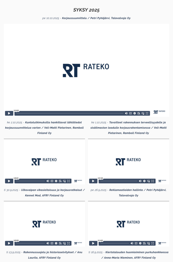 RATEKO puolestaan tuottaa rakennusalan koulutusta. Heille toteutettiin laaja webinaarisarja korjausrakentamiseen liittyvistä teemoista.